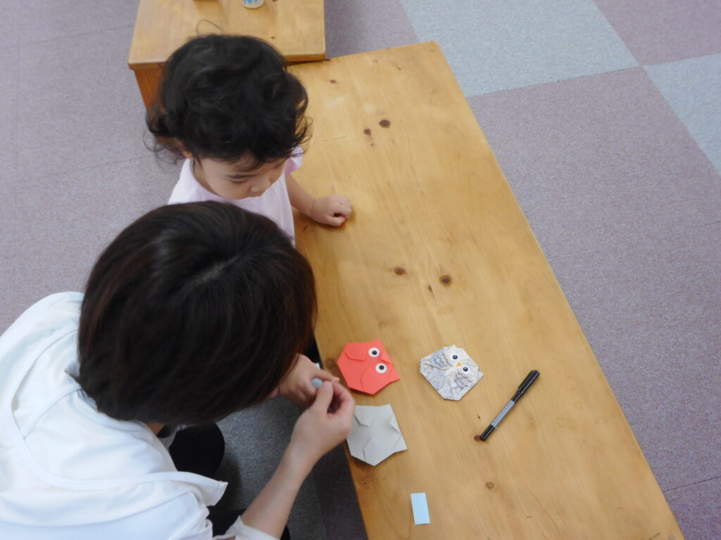 こんにちは(*^-^*) 朝晩が涼しくなり、過ごしやすくなりましたね(⌒∇⌒) 今日は、宮野先生に来ていただいて、「折り紙教室」を行いました。 今日の折り紙は「ミミズクさん」🦉 親子で、上手に作っていました(o^―^o) 次回の「折り紙教室」は、10月16日(木)11:00~です。 ご参加、お待ちしています(^^)/