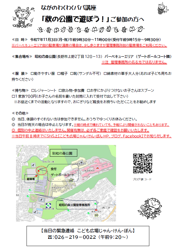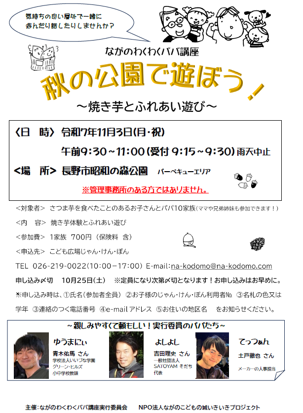 ✨ながのわくわくパパ講座✨ ~秋の公園で遊ぼう!~🍠焼芋とふれあい遊び~ 令和7年11月3日(月・祝)開催です! 詳細:添付チラシ参照 対象:焼芋を食べたことのある乳幼児(未就学児)&パパと家族 (兄弟姉妹・ママ、ご家族の参加もできます) 定員:10組 お申込み受付中です🎵🍠💖 《申込先》 こども広場じゃん・けん・ぽん 窓口、電話:026-219-0022 Mail:na-kodomo☆na-kodomo.com(☆を@に変換) 🌳昭和の森公園で、パパと一緒に秋を満喫しましょう! 主催:ながのわくわくパパ講座実行委員会、ながのこどもの城いきいきプロジェクト ~~~~~~~~~~~~~~~~~~~~~~~~~ 10月8日(水)午前11時~ じゃん・けん・ぽんフロアで行います 玉入れや体操、みんなでサーキットなど、乳幼児親子さんが楽しめる内容を企画しています💖 遊びに来てください(#^.^#)
