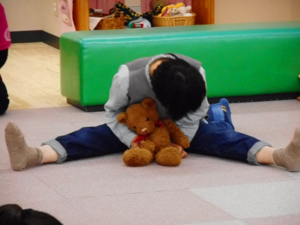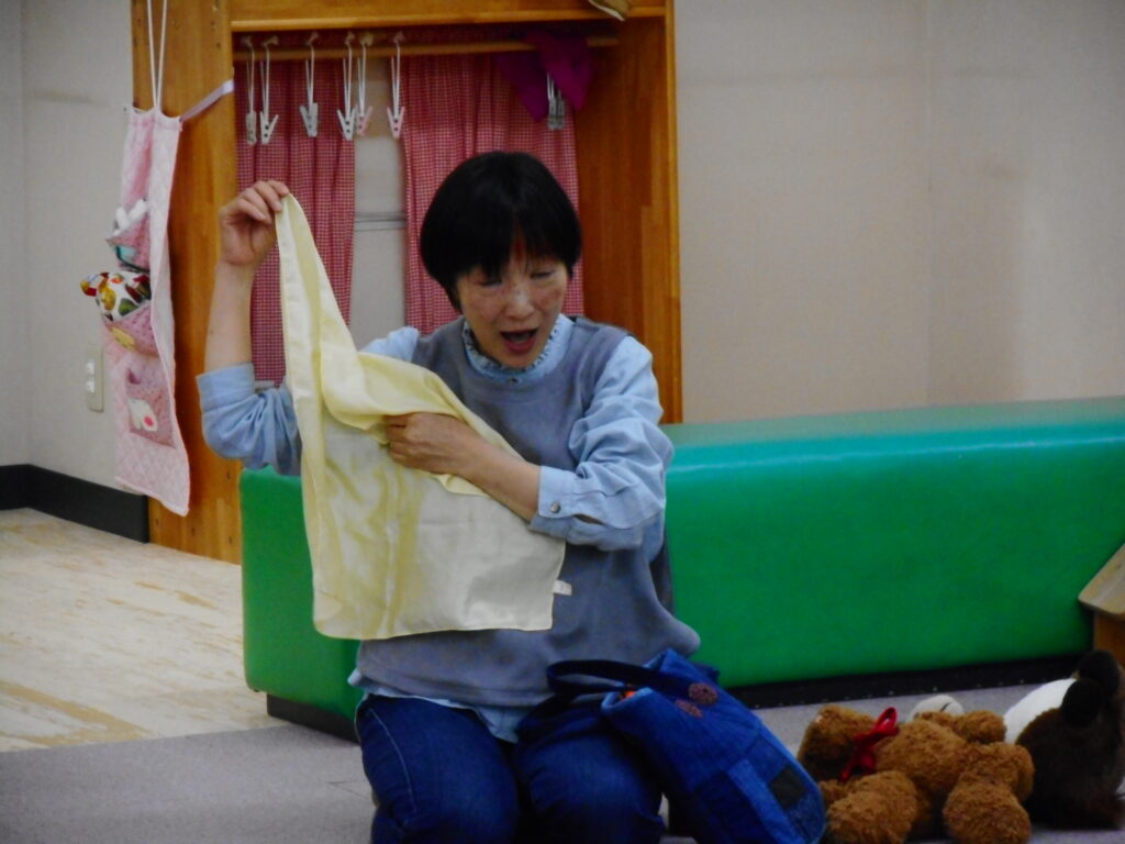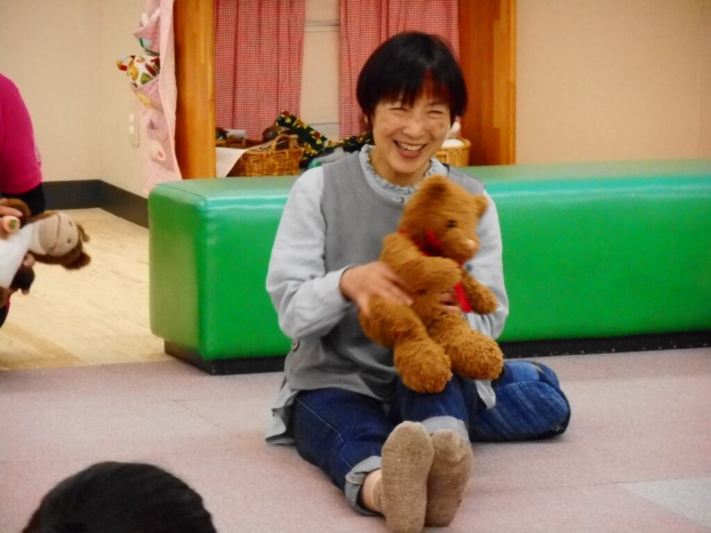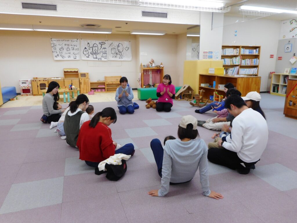 こんにちは😊 今朝は冷え込み、すかっり秋ですね🌰 今日は、「ばぶちゃんからのおはなしわらべうた」がありました。 ♪こん こん ちきちー こん ちきちー♪ 拍子木の音と共にいつものように始まると、じゅうたんコーナーにたくさんの親子さんが集まりました。 ♪じーじーばぁ じーじーばぁ ちりん ぽろんと とんでったー♪ 稲冨さんの布の動きに、赤ちゃんたちも釘付けでしたよ👀 ♪おらうちの どてかぼちゃ 日に焼けて くわれない どっしーん♪ こどもたちをお母さんやお父さんのおひざに乗せ、わらべうたに合わせて、 ”ゆ~らゆ~ら どっしーん” 親子一緒にからだを使って、わらべうたを満喫していました(⌒∇⌒) 次回の「ばぶちゃんからのおはなしわらべうた」11月26日(水)14:30~です。 ご参加、お待ちしています(^▽^)/