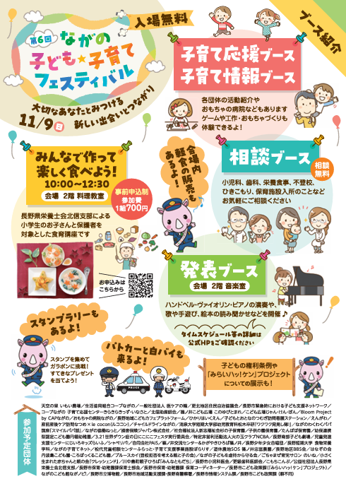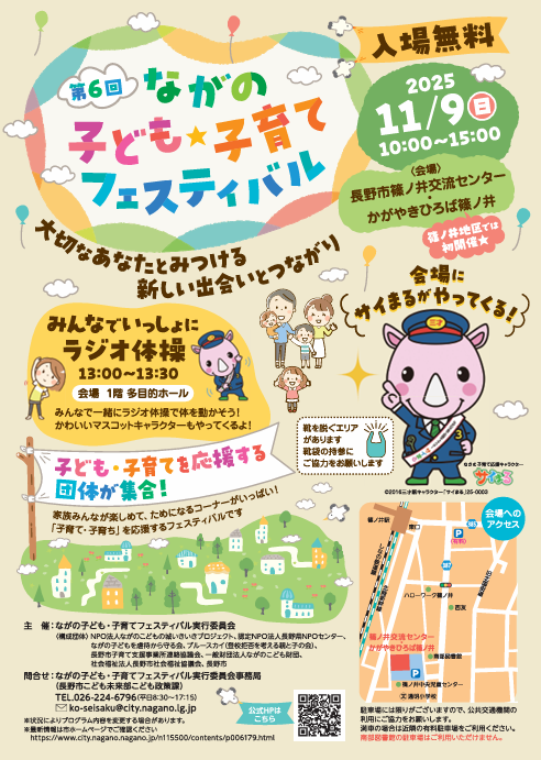 明日、11月9日(日)は楽しいイベントがあります! 第6回ながの子ども☆子育てフェスティバル ㏌篠ノ井交流センター・かがやきひろば篠ノ井 子ども・子育てを応援する団体が集合します。 『じゃん・けん・ぽん』ブースや『パパ講座』のブースもあります。 サイまるも来るよ!! 遊びに来てね!