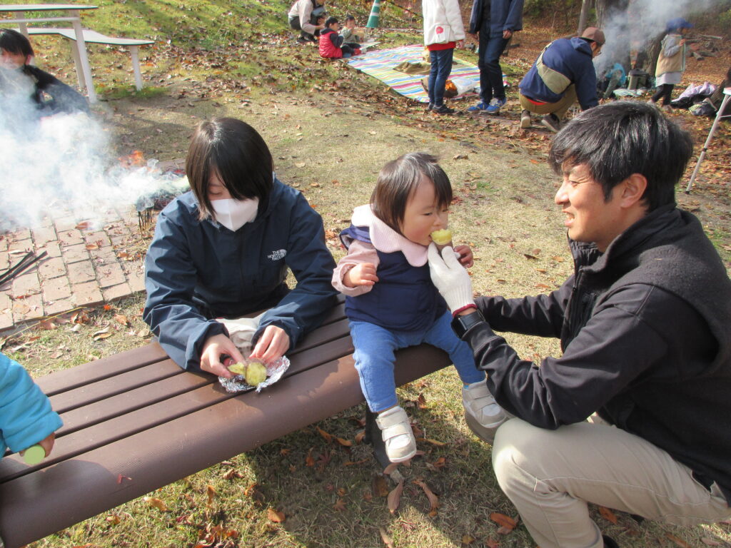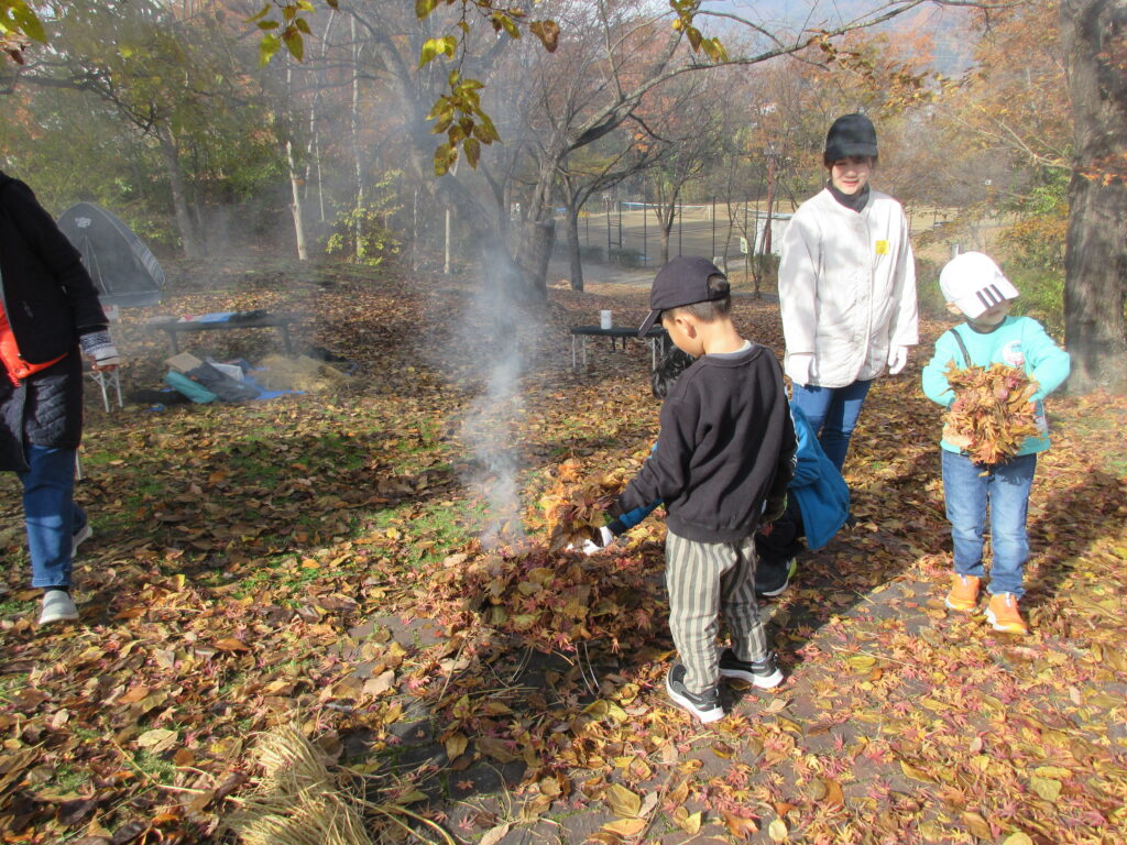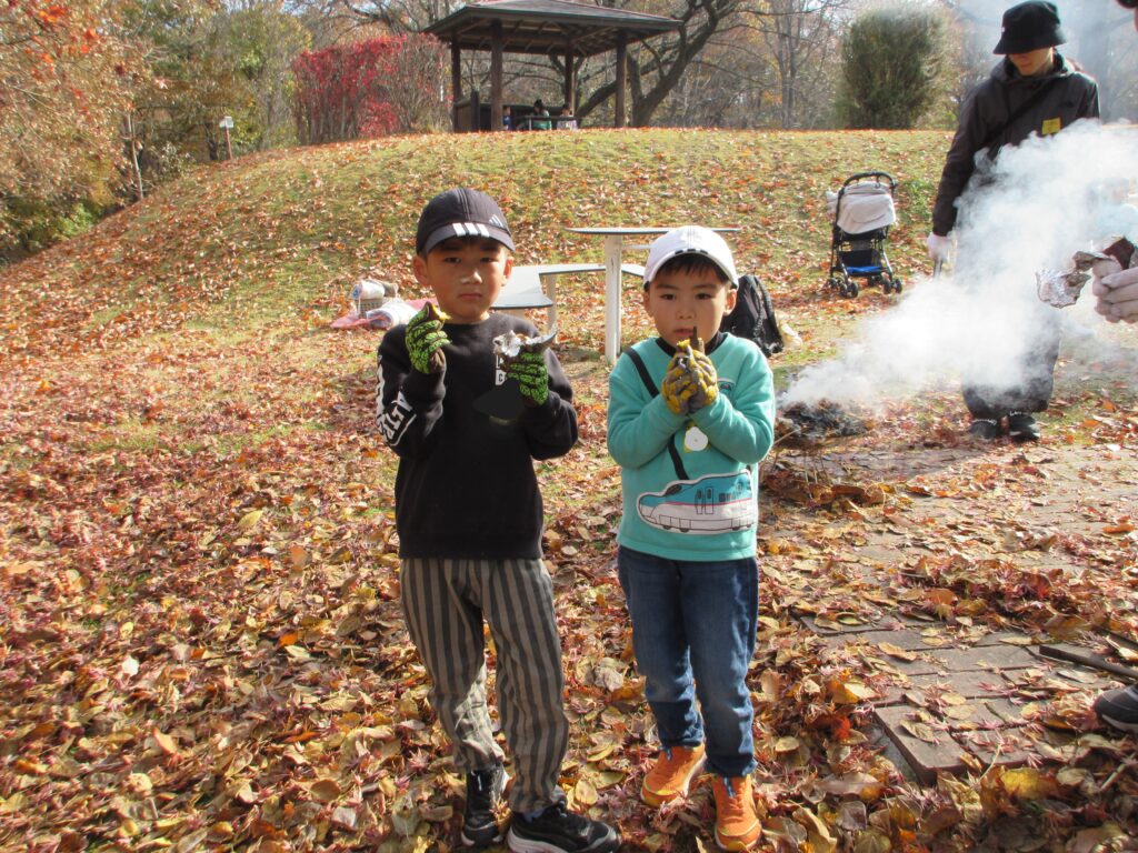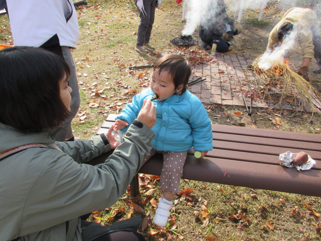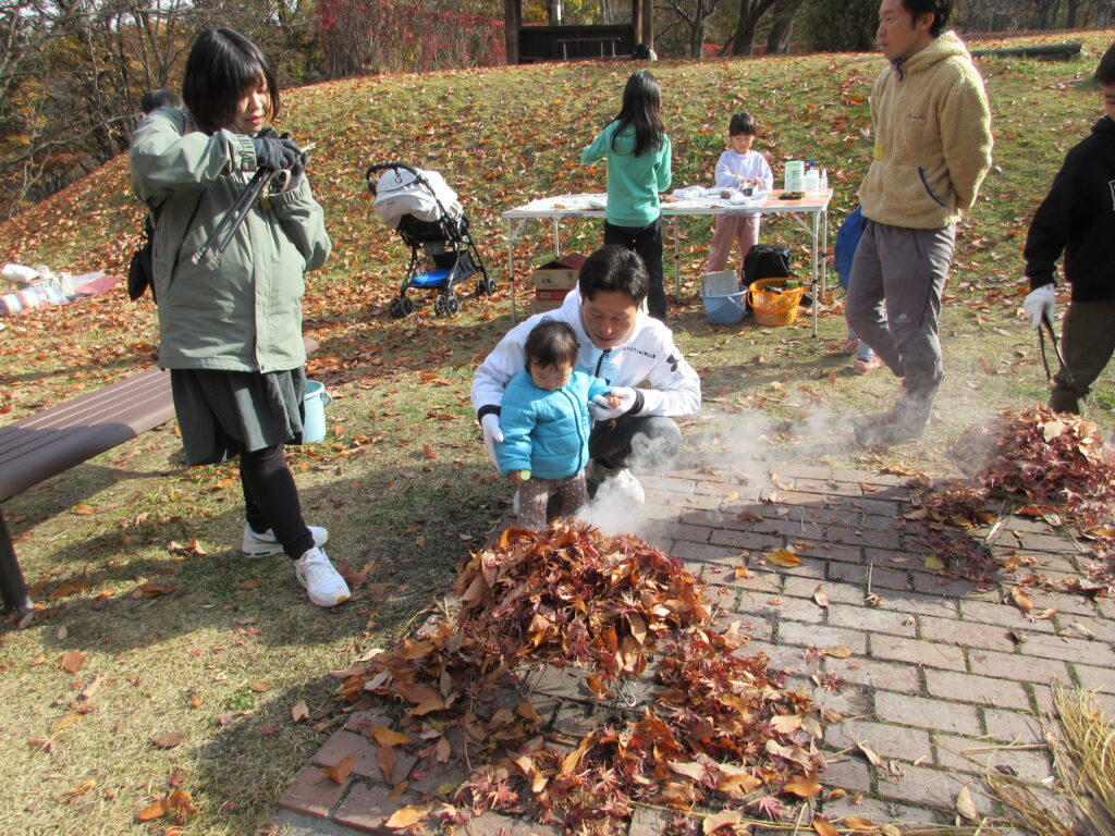 気持ち良く晴れた秋空の下、パパ講座「秋の公園で遊ぼう!」が行われました。 落ち葉が積もって歩くとカサコソと音がして素敵な景色が広がっていました。 お名前よびや♬やきいもじゃんけんで、体も心も温まったところで 実行委員さんの「今日は火で遊びましょう!」の声とともに いよいよ焼き芋を始めました。おいしいお芋にするためにみんな一生懸命落ち葉を運んでくれました。 落ち葉の階段をゆっくり楽しむお子さんもいました。 パパ達は火加減を保ってくれたおかげで焼き芋ができあがりました! いろんな味の焼き芋、いろんな食べ方。 秋の公園においしい笑顔がこぼれました。 皆さんおつかれさまでした!