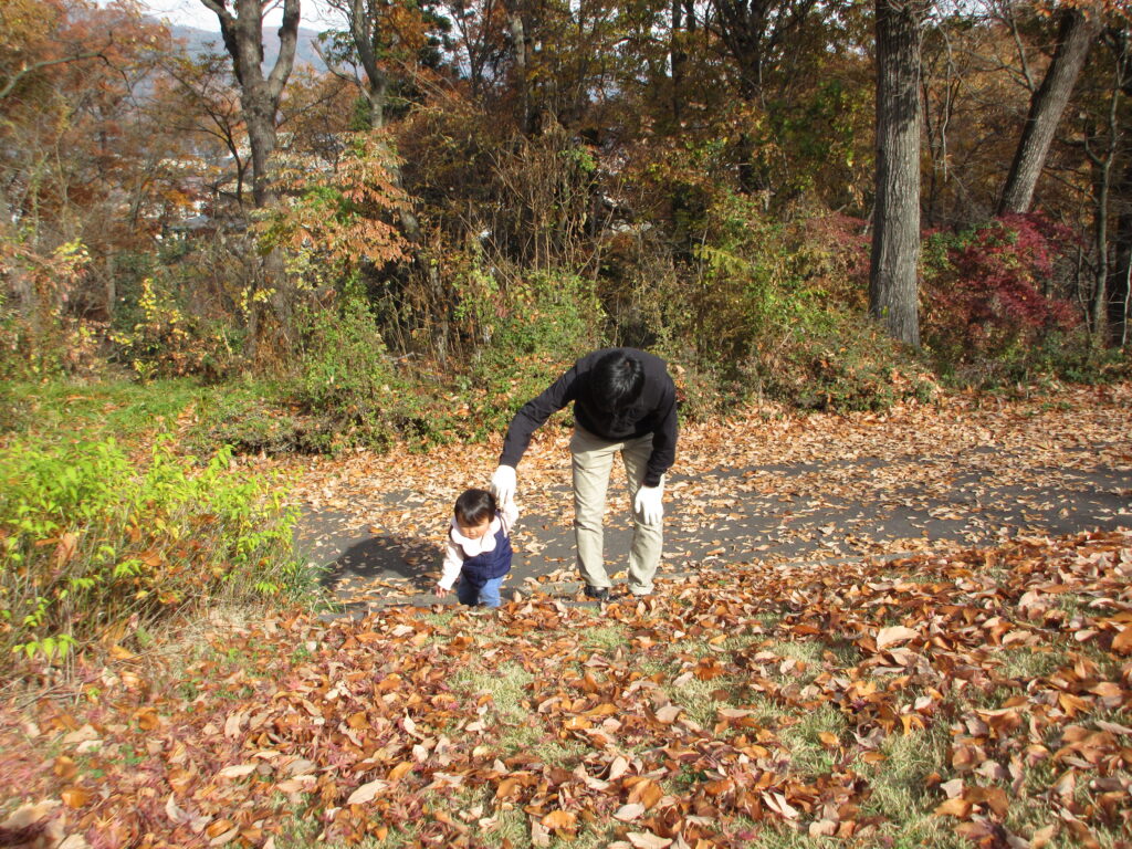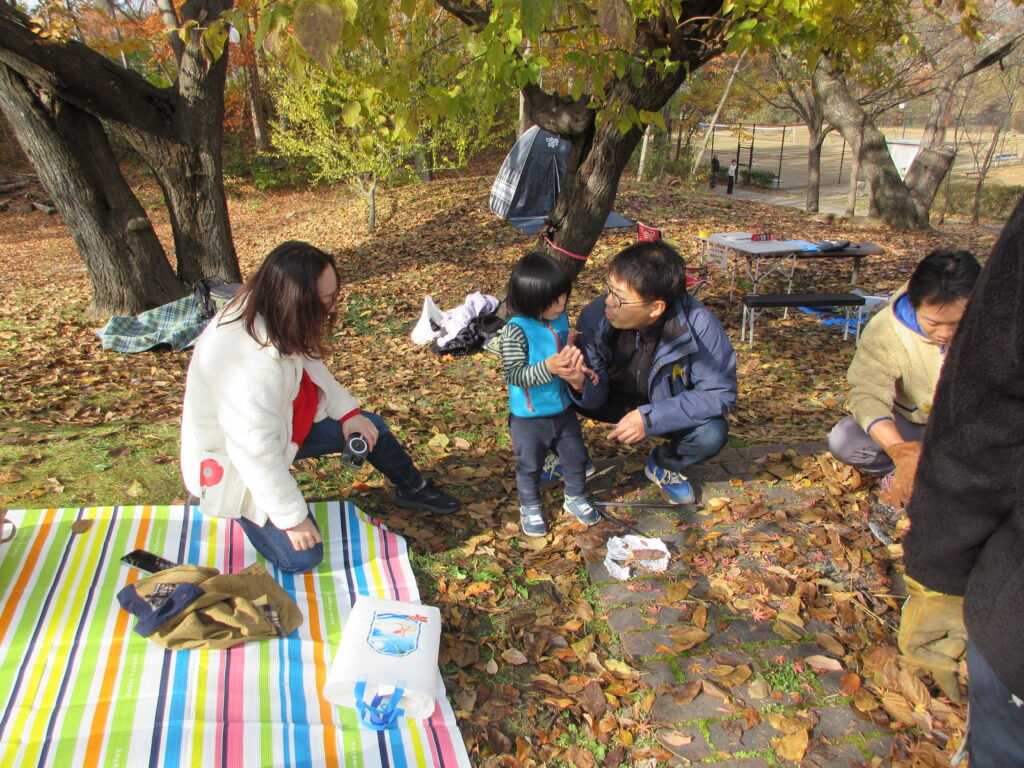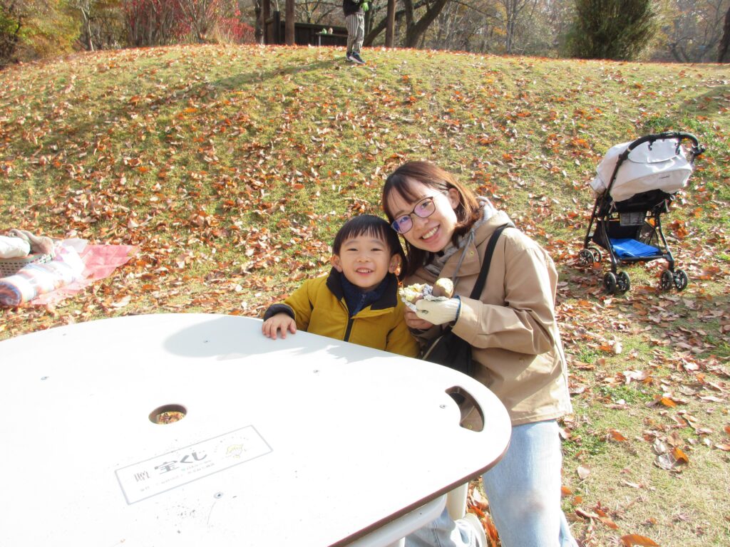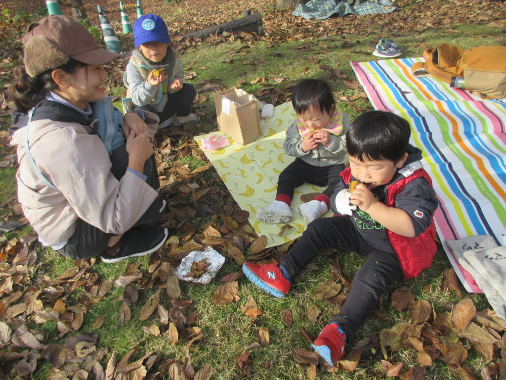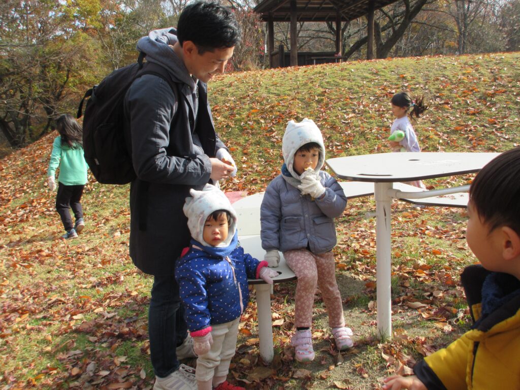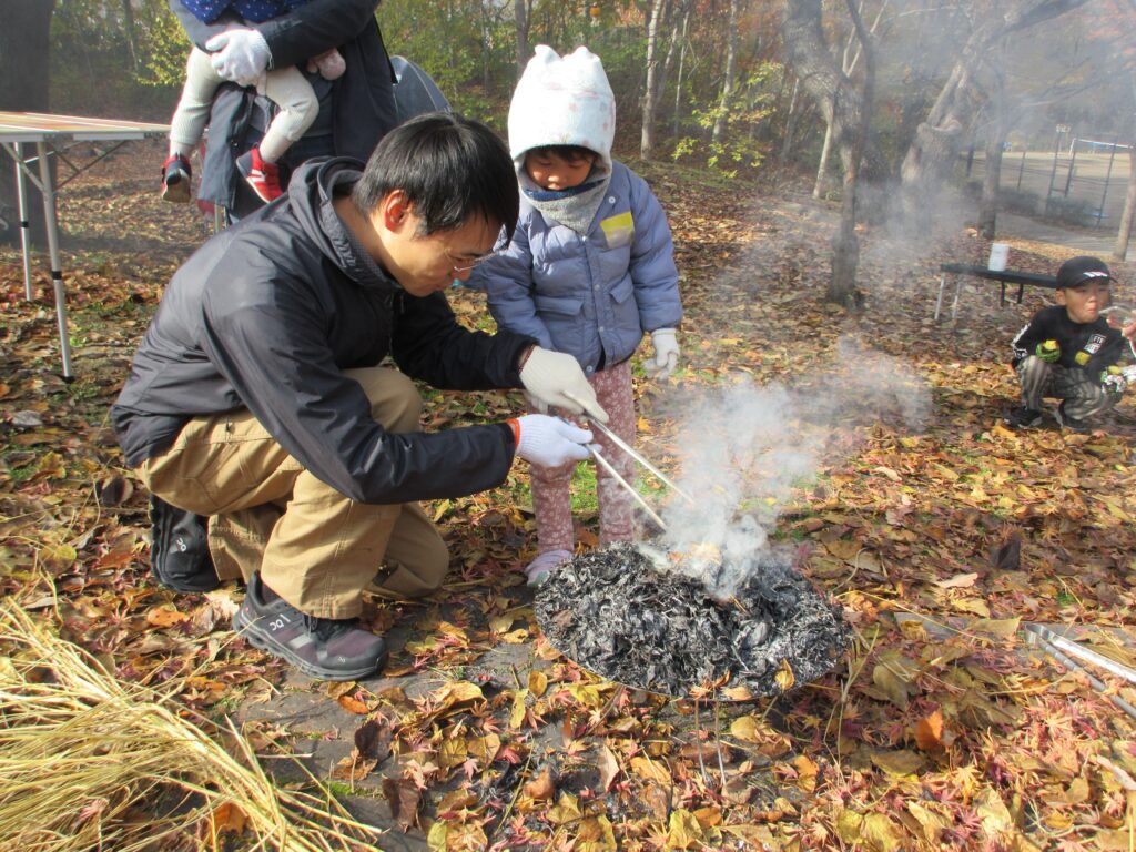 気持ち良く晴れた秋空の下、パパ講座「秋の公園で遊ぼう!」が行われました。 落ち葉が積もって歩くとカサコソと音がして素敵な景色が広がっていました。 お名前よびや♬やきいもじゃんけんで、体も心も温まったところで 実行委員さんの「今日は火で遊びましょう!」の声とともに いよいよ焼き芋を始めました。おいしいお芋にするためにみんな一生懸命落ち葉を運んでくれました。 落ち葉の階段をゆっくり楽しむお子さんもいました。 パパ達は火加減を保ってくれたおかげで焼き芋ができあがりました! いろんな味の焼き芋、いろんな食べ方。 秋の公園においしい笑顔がこぼれました。 皆さんおつかれさまでした!