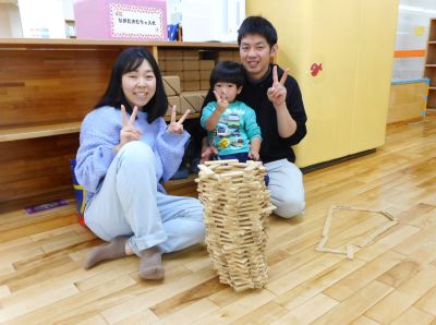 ~親子でふれあい遊び~ (きーたよ きたよ) おうちの方に”ぎゅー”と抱きしめてもらったり、”こちょこちょ”とくすぐってもらったり、 ”高い高ーい”してもらったり、 もっと”高い高ーい”してもらいました。笑顔いっぱい💕 ~親子で力を合わせて~ (カプラ) ”カプラ”を積み重ねて、すてきな作品ができあがり!! 作った後は、壊す・・・カプラの良い音が聞こえました♪ <お知らせ> リユースマーケット始まりました(~30日(日)まで)。