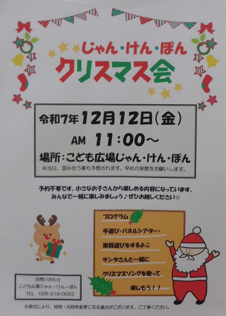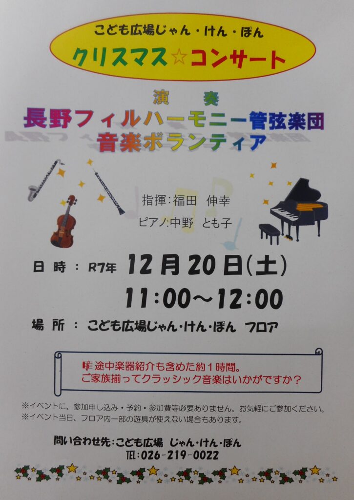 早いもので、もうすぐ12月 じゃん・けん・ぽんで行われるクリスマスイベントのお知らせです。 ☆「じゃん・けん・ぽん クリスマス会」 サンタさん遊びに来てくれるといいですね! ☆「クリスマス☆コンサート」 長野フィルハーモニー管弦楽団のみなさんによる素敵なコンサートです。 たくさんお誘い合わせの上、ぜひお越しください。