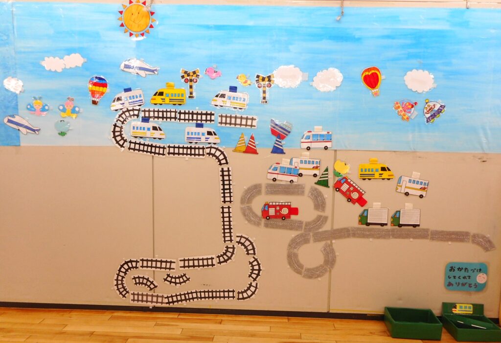 電車がいっぱい🚃 2025年11月29日 11月の工作は「でんしゃ」でした。 たくさんつながりましたね。みんなの電車は、どこに行くのかな!! 磁石でくっつく”電車と車の街”は、線路も道路も毎日変化しています。今日もたのしそう!!