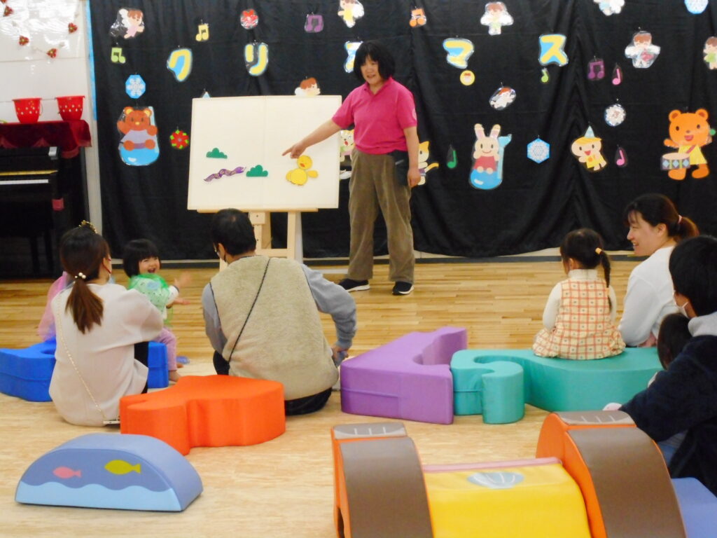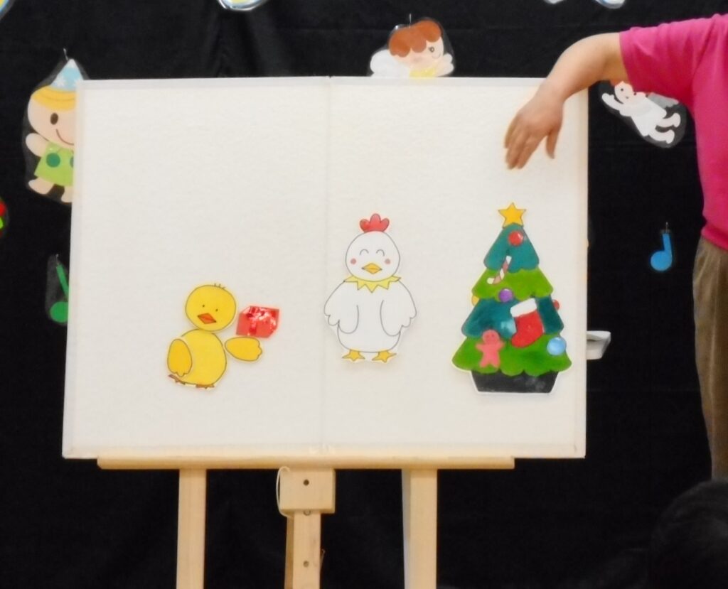 今日のおはながわらった♪の時間は、ひよこちゃんのパネルを楽しみました。 ひよこちゃんは森に出かけて、いろんなどうぶつさんに出会います。 こども達は「へびさん!」「かえるさん!」と知っているものの名前を当てて、 みんなで一緒に楽しみました。 最後にサンタさんに出会います。 ひよこちゃんはプレゼントをもらえたかな?