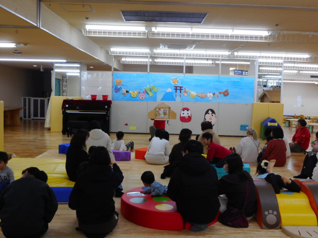 1/10(土)~1/12(月)成人の日まで3日間の連休、初日です! 今日の午前中は、館内賑わっておりましたが、 午後は少な目で皆さんゆったりと遊んでいらっしゃいます。 少し大きなお子さんが来てくれる休日は、♪おはながわらったの歌も、 スタッフの大人の声の混じって可愛い歌声が加わります。 一緒に歌うって、それだけで楽しいものですね。 今日の午前中は、 もちっこやいてのわらべうたで遊び、紙芝居を見て、動物ロケットでいっぱいジャンプしました。