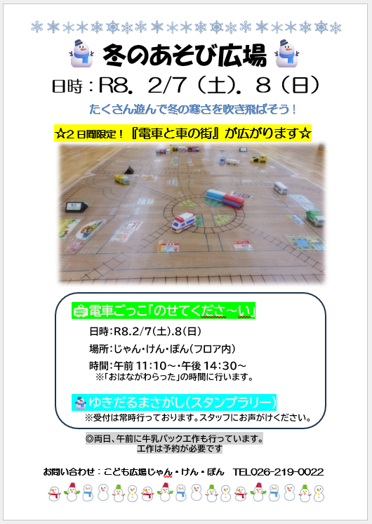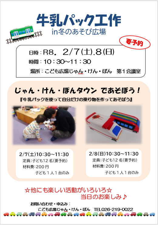 こども広場じゃんけんぽんでは、 寒~い冬でも楽しく遊べるよう、 今年も『冬のあそび広場』を開催いたします! 絵本「がたんごとんがたんごとん」(安西水丸さく 福音館書店)の世界観で 電車ごっこを楽しんだり、雪だるまさがしをしたり、 みんなで集まって楽しく遊びましょう! さてこちらは、 昨年好評だった「牛乳パック工作」です。 なんのへんてつもない牛乳パックが、 電車や車に変身します。 手作りの乗り物は、出来上がると満足感がありますよ。 材料を用意する都合で『要予約』となっております。 奮ってお申し込みください!