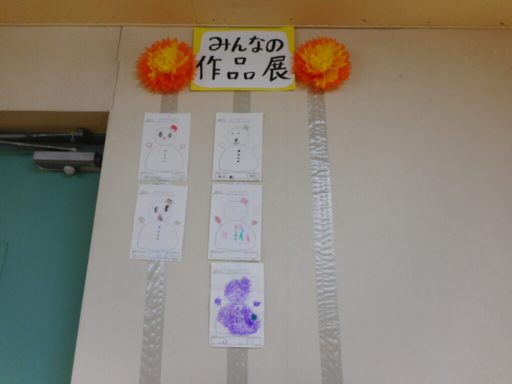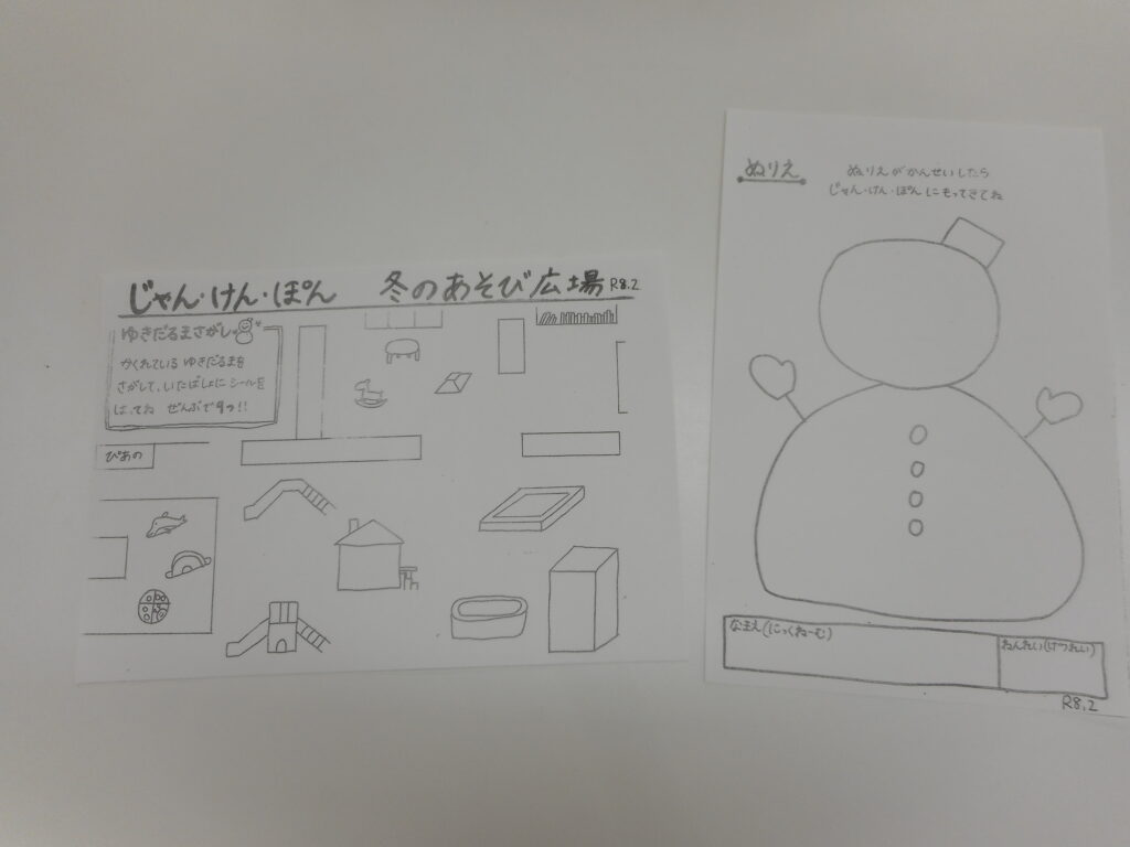 2月7日、8日に行われた冬のあそび広場の「雪だるまさがし」 頑張って9個探した方に渡された「雪だるまのぬり絵」の作品展開催中! まだ少しなので、お家にお持ちの方、じゃん・けん・ぽんに飾りませんか? ぜひお持ちください。 2月中開催予定です。 「雪だるまさがし」もまだまだ出来ます。 スタッフに声掛けください。