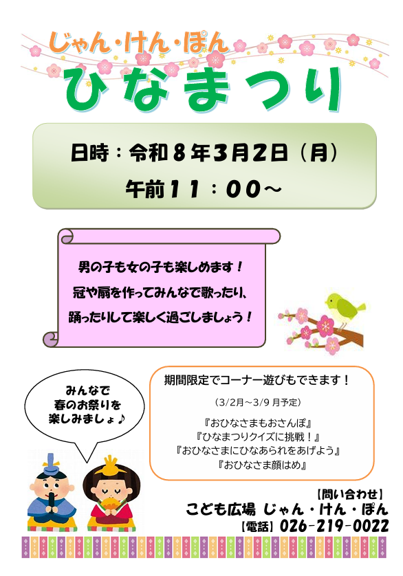 今日は、お天気も良くお出かけ日和。多くの方にご来館いただきました。 ひなまつりが近いので、「うれしいひなまつり」の曲に合わせて踊りをしました。 3月2日(月)のひなまつり会でも踊りますので、みなさんも一緒に踊りましょうね。 ひなまつり会は普段の♪おはながわらったの時間より早めの 11:00から始まります!ご承知おきください。