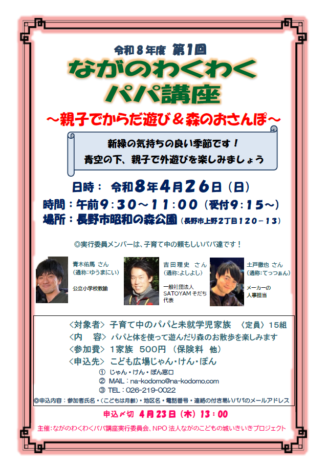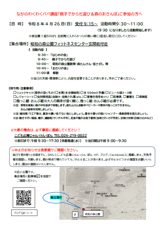 2026年4月26日 ~親子でからだ遊び&森のおさんぽ~ 時間 9:30~11:00(受付 9:15~) 場所 長野市昭和の森公園