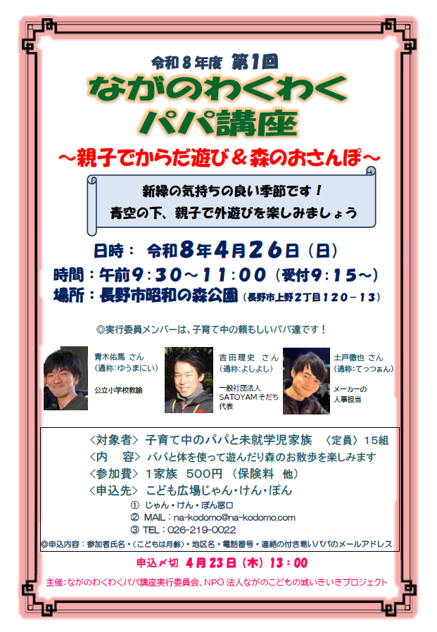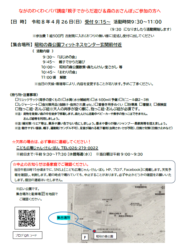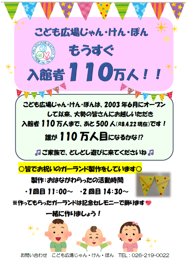4/26(日)はパパ講座!昭和の森公園!! お席に少し余裕があります。締め切りを明日25(土)17時まで延長しました。 (メール確認最終:17時です) ご参加をお考えの皆さん!お申し込みをお待ちしております(#^.^#) ※詳細は添付チラシをご確認ください お申込み: 電話 026-219-0022 Mail na-kodomo☆na-kodomo.com ☆マークを@に変換 ~~~~~~~~~~~~~~~~~~~~~~~~~~ ◎もうすぐ入館者110万人を迎えます こども広場じゃん・けん・ぽんオープン以来、大勢の皆さんにお越しいただき、ありがとうございます。 ◎入館者110万人目を目指して!遊びに来てください🌹 ◎お祝いのガーランドを作っています。一緒に作りましょう! ◎入場者110万人記念セレモニーは5/14(木)を予定しています ※詳細は添付チラシをご覧ください。