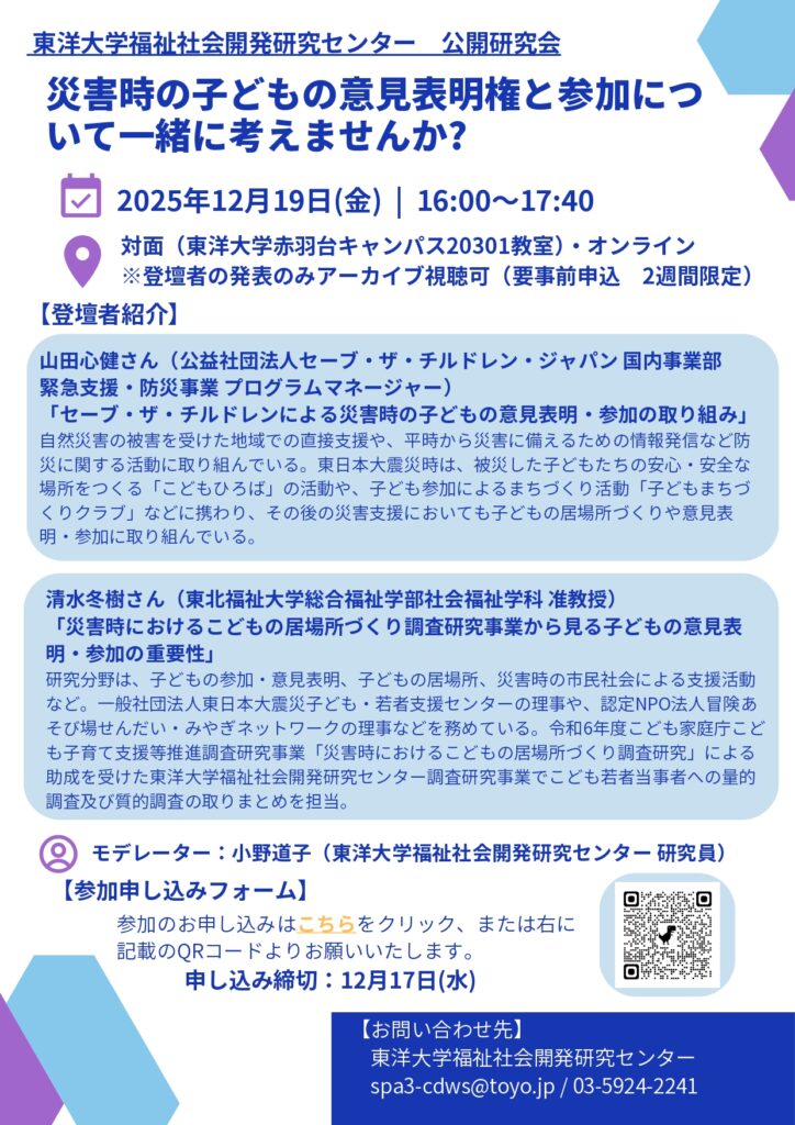 【テーマ】 「災害時の子どもの意見表明権と参加について一緒に考えませんか?」