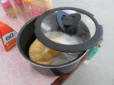 ポイントは、袋に穴が空かないように鍋の中にお皿を敷くことと、中火で加熱すること!