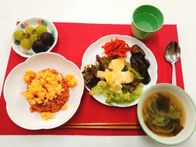 チキンライス、リンゴとジャガイモのサラダ、にんじんしりしり、ナスの甘辛炒め、玉ねぎスープ🧅
