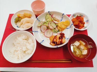 鶏肉のフリッター、フライドポテト、野菜サラダ、ナスと冬瓜のケチャップ炒め、豆腐の味噌汁、ご飯🍚