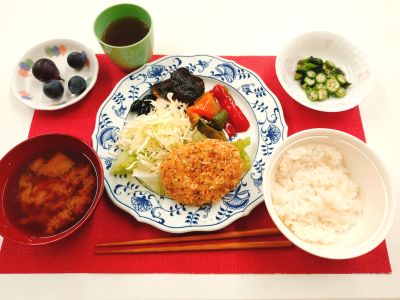 焼きコロッケ、ピーマンの煮浸し、ナスのゴマ味噌掛け、オクラと昆布の酢の物、ナスの味噌汁、ご飯🍚