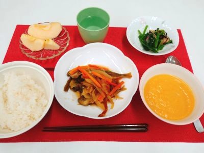 豆アジの南蛮漬け、小カブの葉と二十日大根のお浸し、かぼちゃとカブの豆乳ポタージュ、ご飯🍚