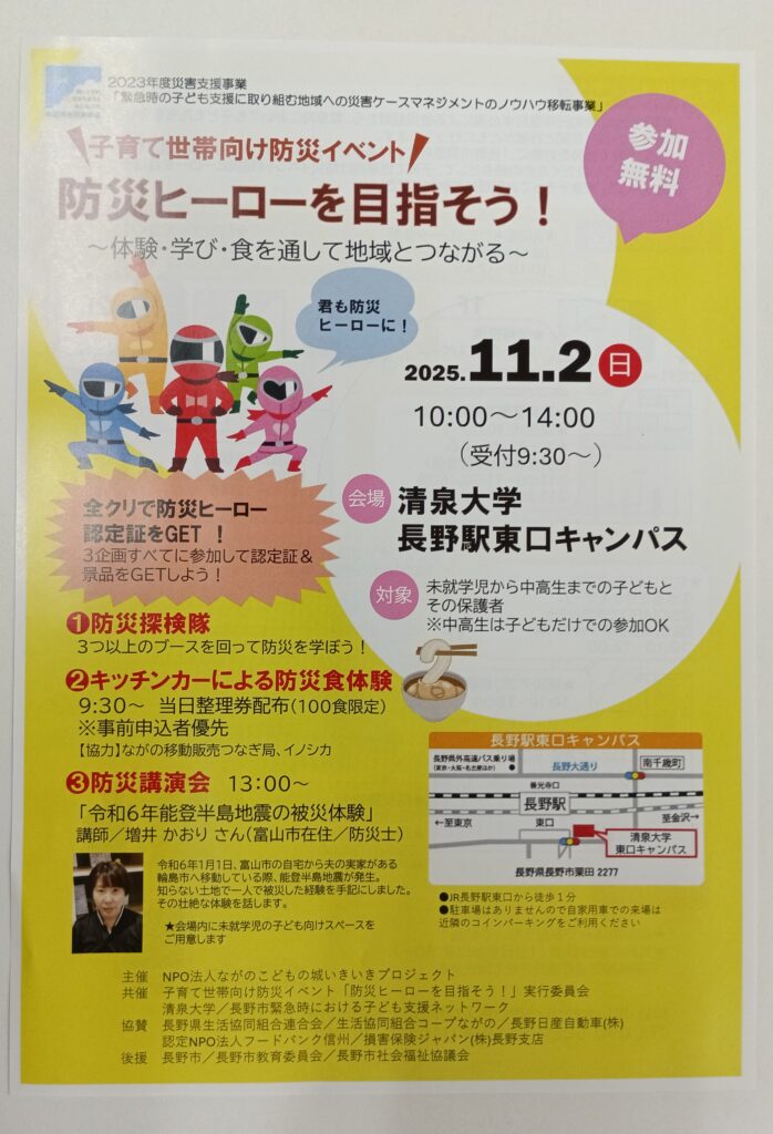 今日は、暖かく感じる秋の1日でした。 今週の日曜日11月2日に、当NPO法人ながのこどもの城いきいきプロジェクト災害支援事業部が主催で、清泉大学東口キャンパスにおいて、子育て世帯向け防災イベントを行います。 令和元年台風19号の豪雨の時に長野市でも大きな被害がでました。こどもの城では、その時から災害時の子ども支援を行っています。そして現在、「緊急時の子ども支援に取り組む地域への災害ケースマネージメントのノウハウ移転事業」を展開しています。 🌸今日の献立🌸 今週の開館日は、28(火)、29(水)、30(木)、31(金)です。 【お申し込み・お問い合わせ先】