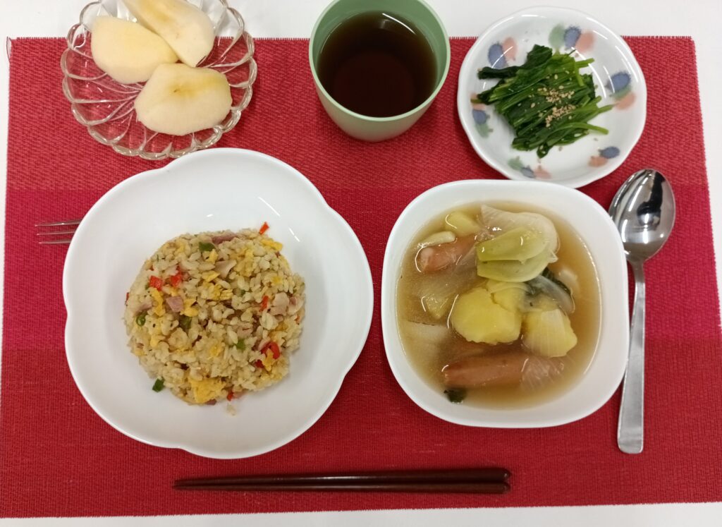 チャーハン、ほうれん草のお浸し、ポトフ、リンゴ