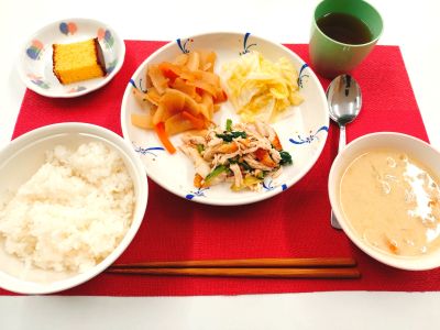 鶏ささみとちくわの和え物にはカブの葉、豆乳スープにはカボチャやサツマイモと秋の野菜がたっぷり🍠