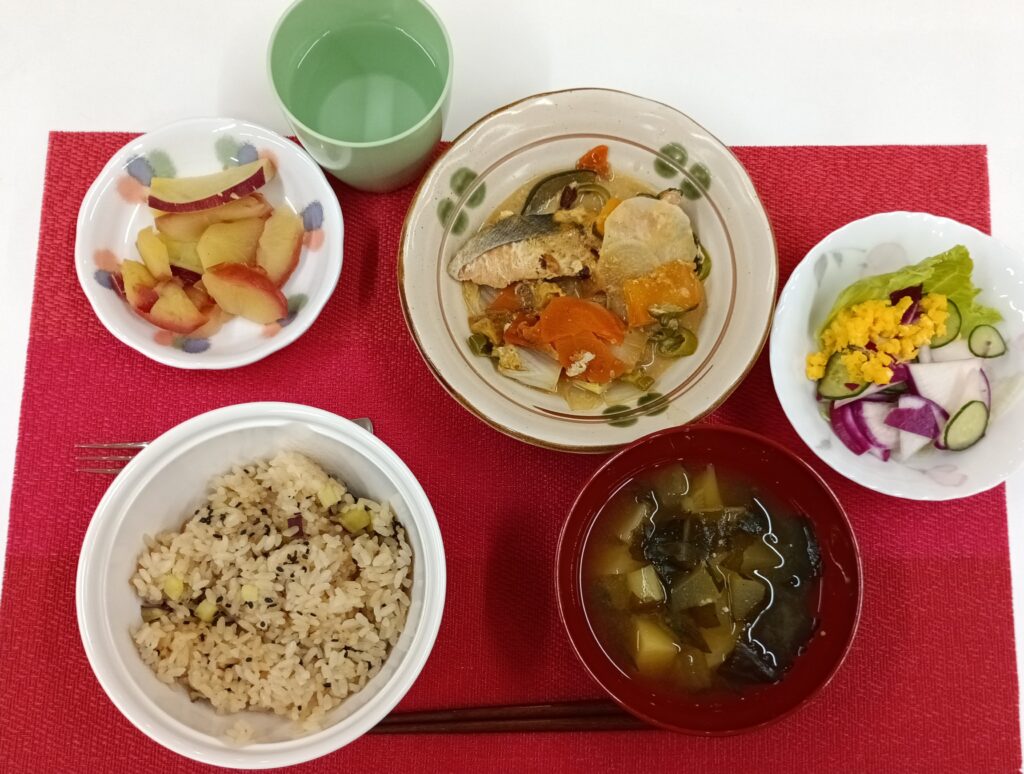 鮭のちゃんちゃん焼き風煮物、赤カブのサラダ、サツマイモご飯、お味噌汁、サツマイモとリンゴの重ね煮