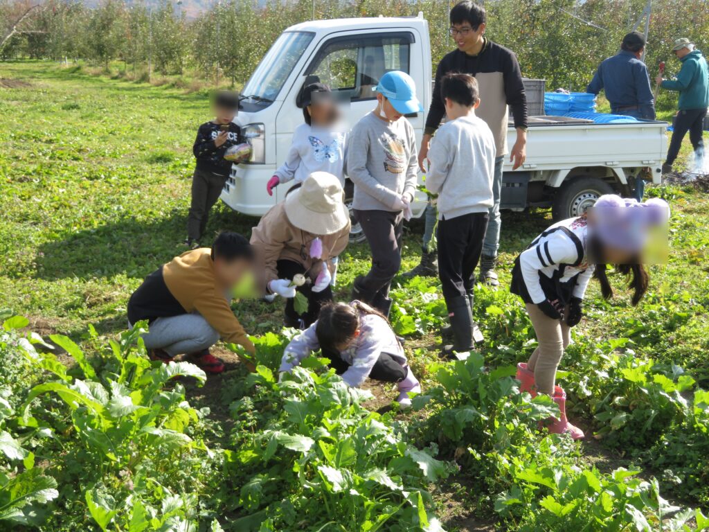 今日は、3回目の農業体験ツアーでした。 いつものように、もんぜんぷら座からタクシーで牧野果樹園に向かいました。 今日は、収穫祭を行います。 始めの会を行った後、早々に焼き芋の準備に取りかかりました。 いつもの畑まで持っていくと、お父さんが焚火をして待っていてくれました。 今日の収穫するリンゴは、リンゴの王様「ふじ」です。 リンゴの収穫をした後、アツアツの🍠焼き芋を食べました。 休憩を挟んで、次は大根やカブ、チンゲンサイを収穫しました。 その後、お昼ご飯をみんなで食べました。 午後は、ゆっくりとお散歩に出かけたり、追いかけごっこしたりして自由に過ごしました。 今週の開館日は、17日(月)、18日(火)、20日(木)、21日(金)、24日(月・振替)です。 【お申し込み・お問い合わせ先】