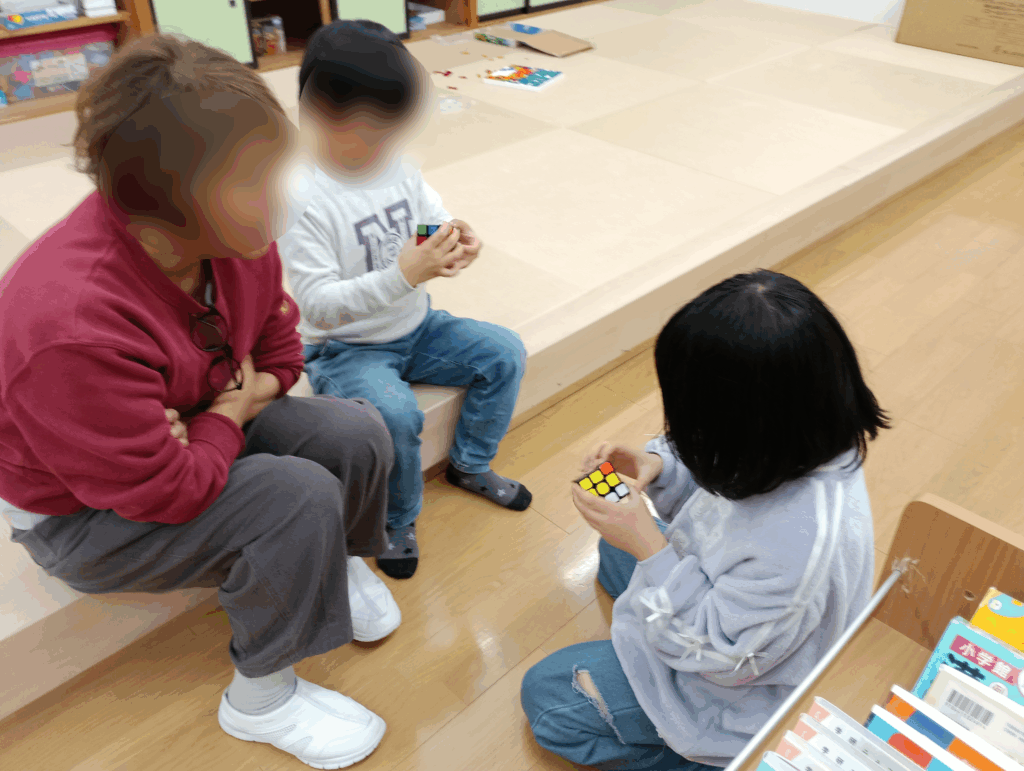「じゃ、1面を赤に揃えてみようね。よーい、スタート!」