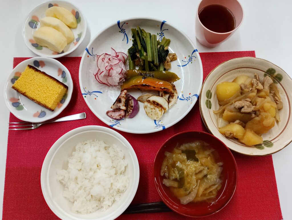 赤かぶとかぶとパプリカのソテー、白菜の味噌汁、リンゴ、カステラ