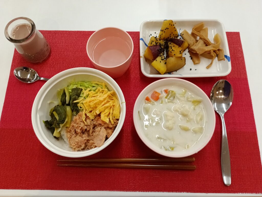・鮭フレーク他三食丼、冬野菜のクリームシチュー、大学芋、メンマ、ココアゼリー