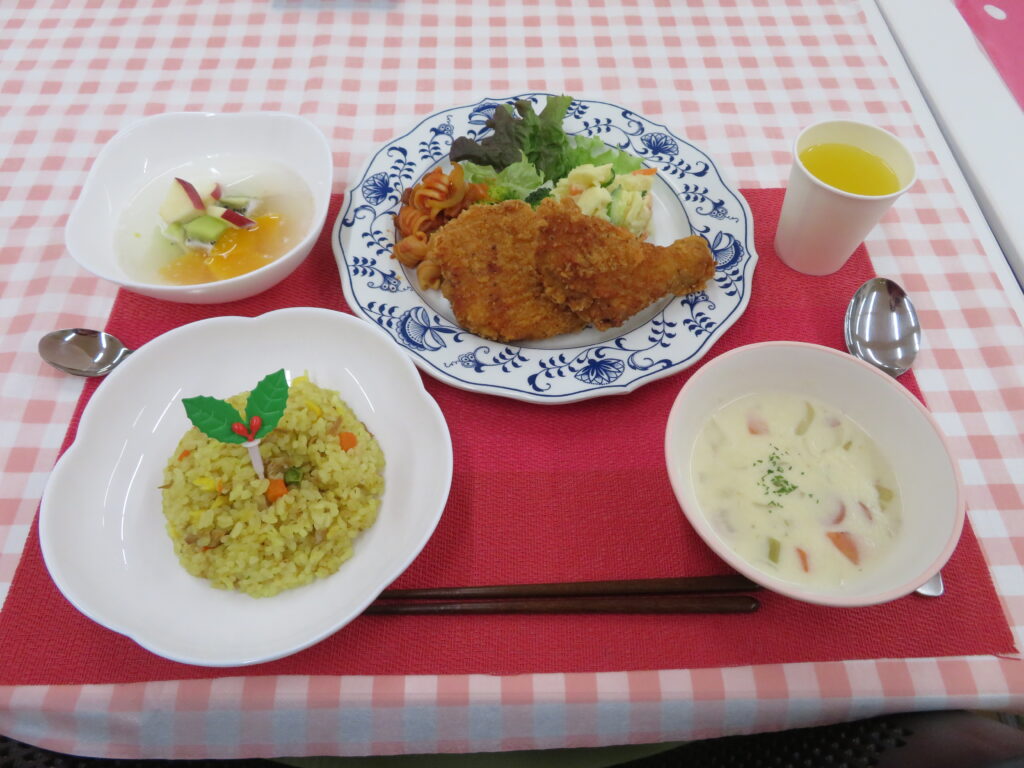 とても豪華なクリスマスランチ。鶏の唐揚げはトマト館さんが揚げてくださいました。その他、ホワイトシチュー、カレーピラフ、 デザートとお腹いっぱいです。