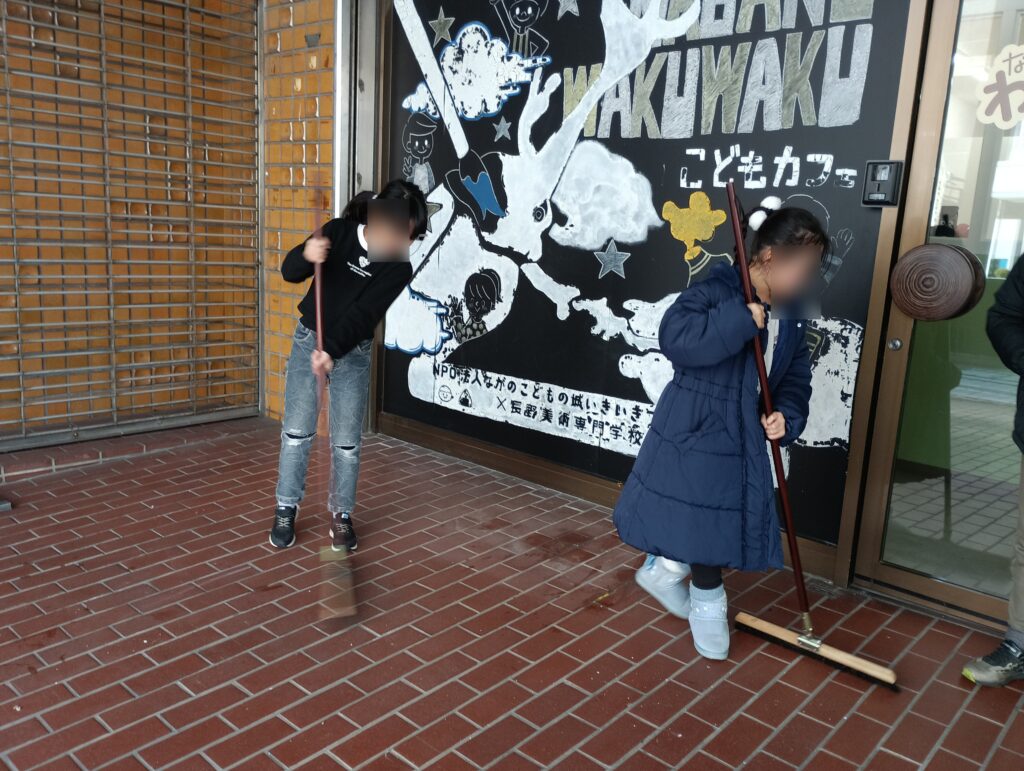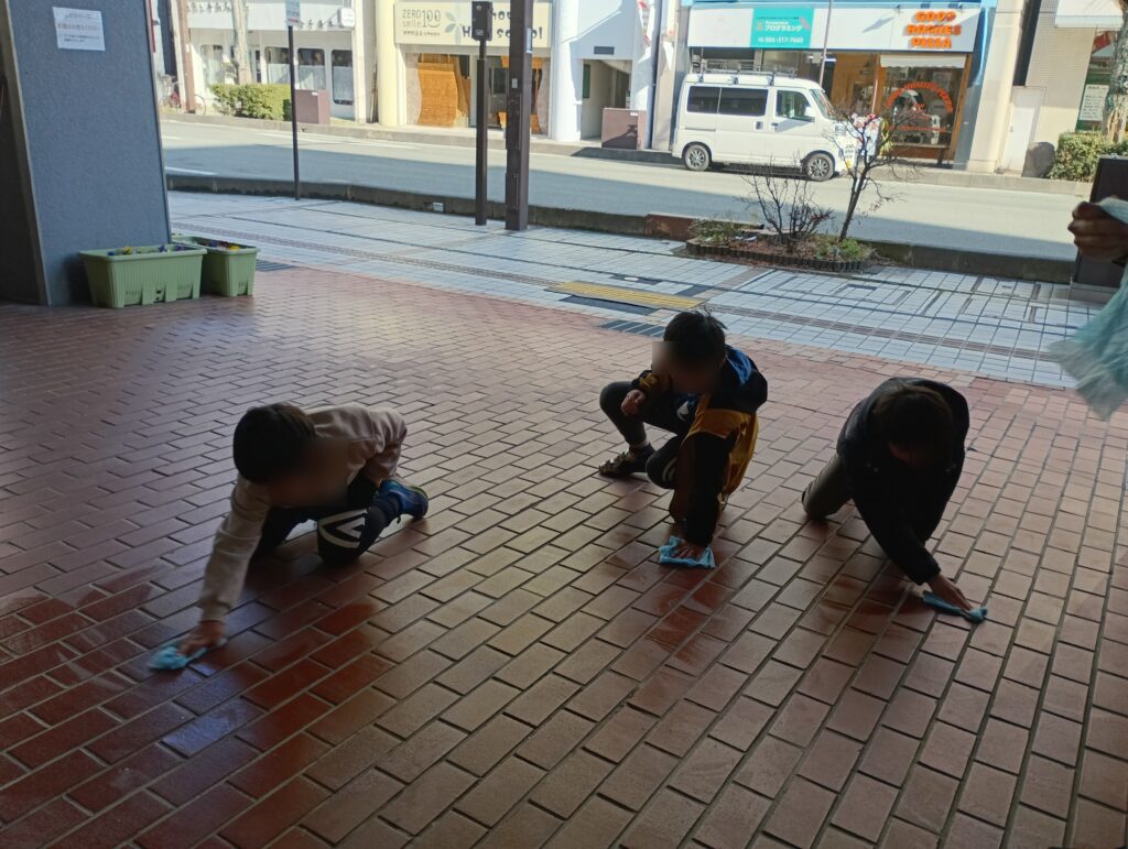 まずホウキでごみを掃き、その後みんなで雑巾をかけました。