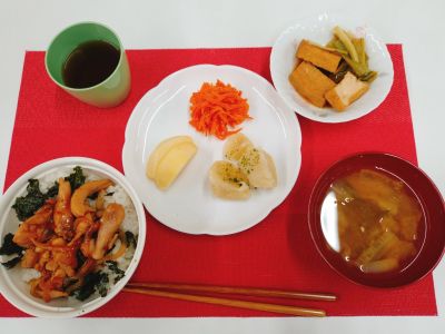 鶏のキジ焼き丼、こふきいも、にんじんしりしり、小松菜と厚揚げの煮浸し、大根とわかめの味噌汁🥢