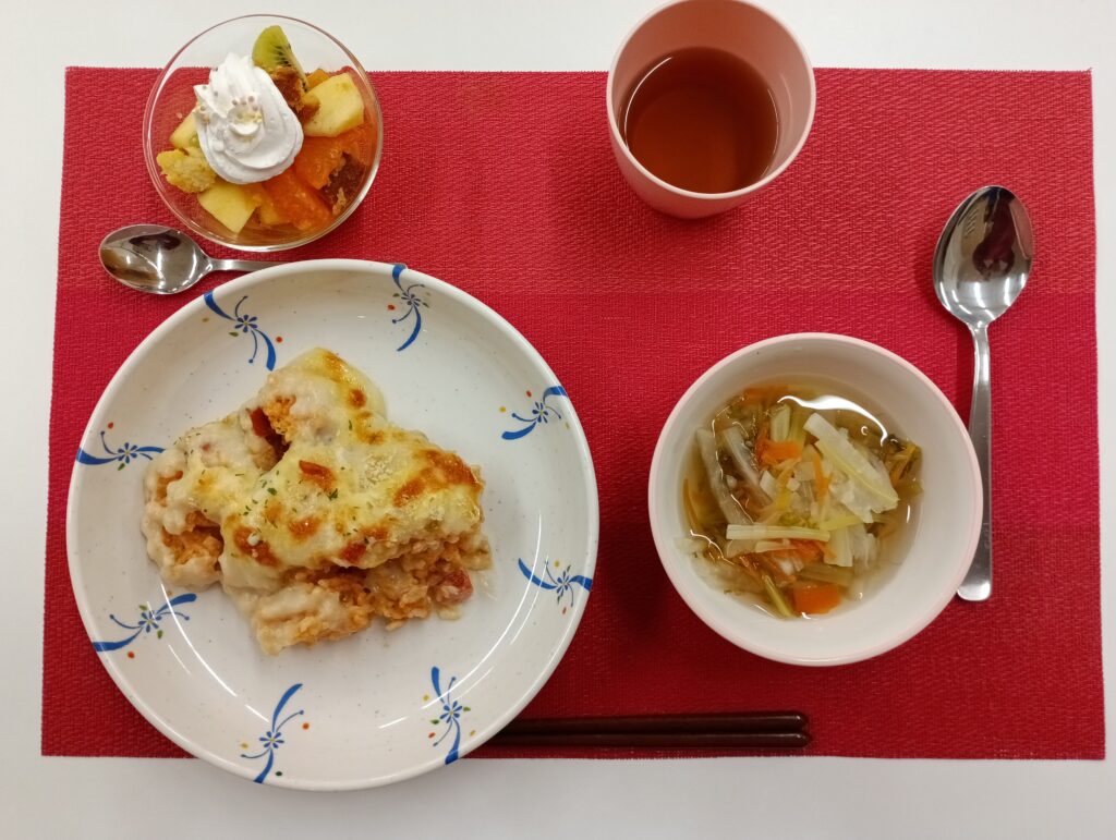 ・ケチャップライスドリア、具たくさんスープ、果物とスポンジケーキのパフェ