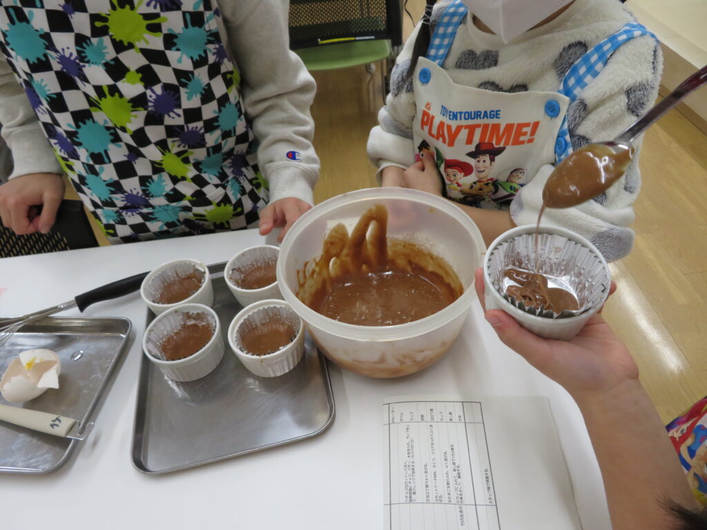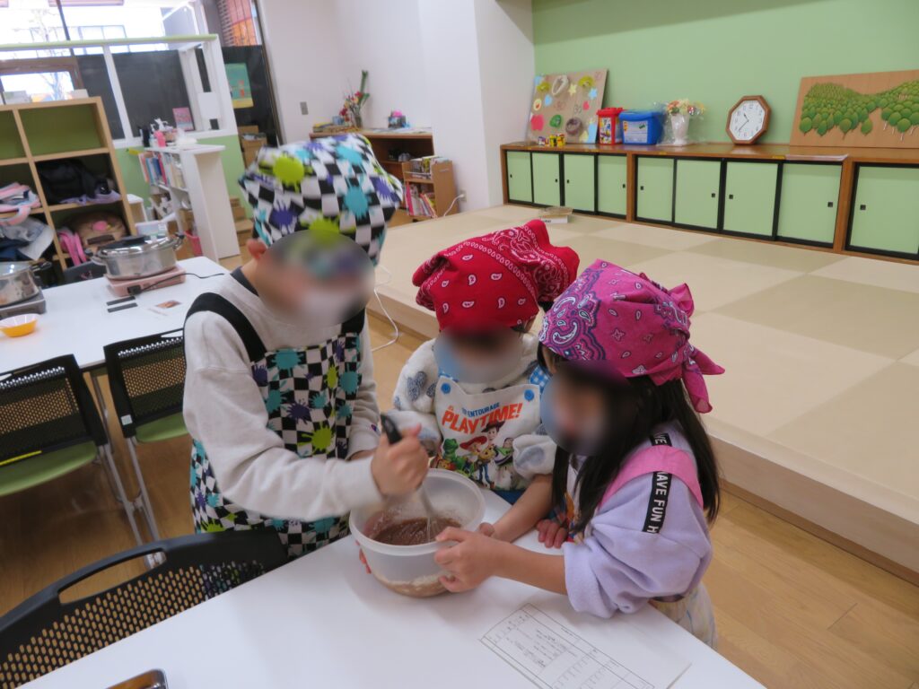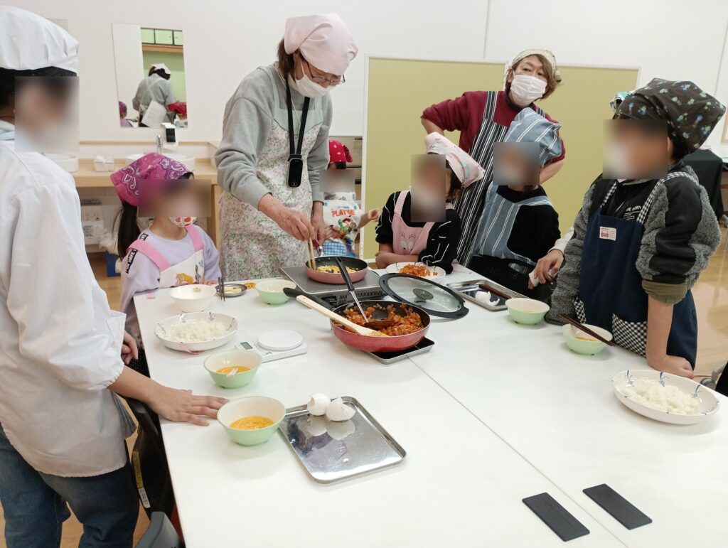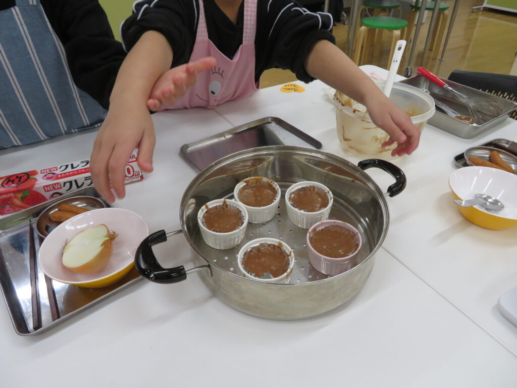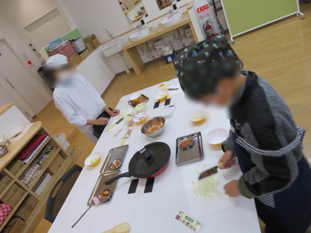 寒い日が続いています。 最初はまず、チョコケーキのチョコを溶かすところから。板チョコを細かくして、バターと牛乳も混ぜて、電子レンジに入れ加熱します。柔らかくしたものを泡立て器でよく混ぜ、他の材料(ホットケーキの粉、砂糖、ココア、たまご)を入れてよく混ぜます。 それをカップに入れて蒸し器で15分ほど蒸すと、ケーキの出来上がりです。 次は、オムライスづくりです。 最初に玉ねぎを粗いみじん切りにします。 まず、みじん切りの玉ねぎをしんなりするまで炒めて、その後、ウィンナーやミックスベジタブルを入れて炒め、味付けをしました。 ご飯を盛って、ソースをのせて、その上にスクランブルエッグを重ねました。 皆さん、とても美味しかったようでもくもくと無言で食べていました。おかわりをする人もいました。 今週の開館日は、2日(月)、3日(火)、5日(木)、6日(金)です。 【お申し込み・お問い合わせ先】