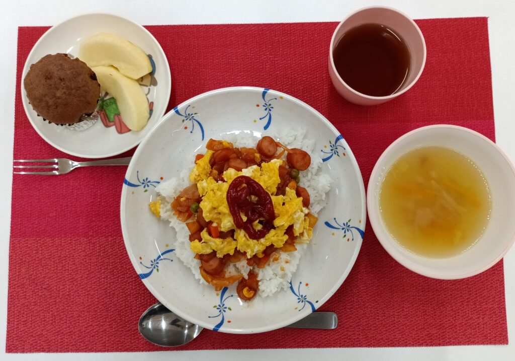 今日のメニューは、「おてがるのせのせオムライス」と「ほわほわチョコケーキ」です。