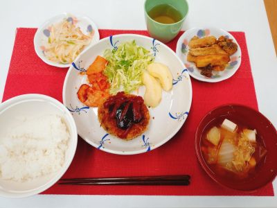 キャベツメンチ、ジャガイモのケチャップ炒め、リンゴとキャベツのコールスローサラダ、白菜と豆腐の味噌汁、ご飯🍚