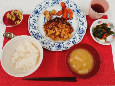 野菜たっぷりお好み焼き、かぼちゃと長芋のソテー、昆布炒め、ジャガイモと油揚げの味噌汁、ご飯🍚