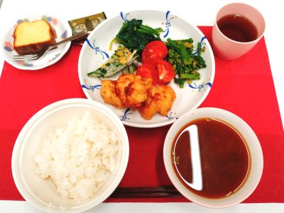 鶏の唐揚げ、山菜の天ぷら、菜の花のゴマ和え、ほうれん草のお浸し、なめこの味噌汁、ご飯🍚