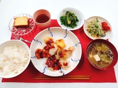 いろいろ野菜と鶏肉のグリル、菜の花のゴマ和え、ダイコンと水菜のサラダ、豆腐となめこの味噌汁、ご飯🍚