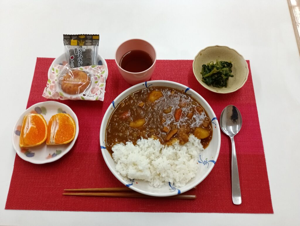 ・カレー・ほうれん草の胡麻和え・デコポン・柚餅子とマドレーヌ